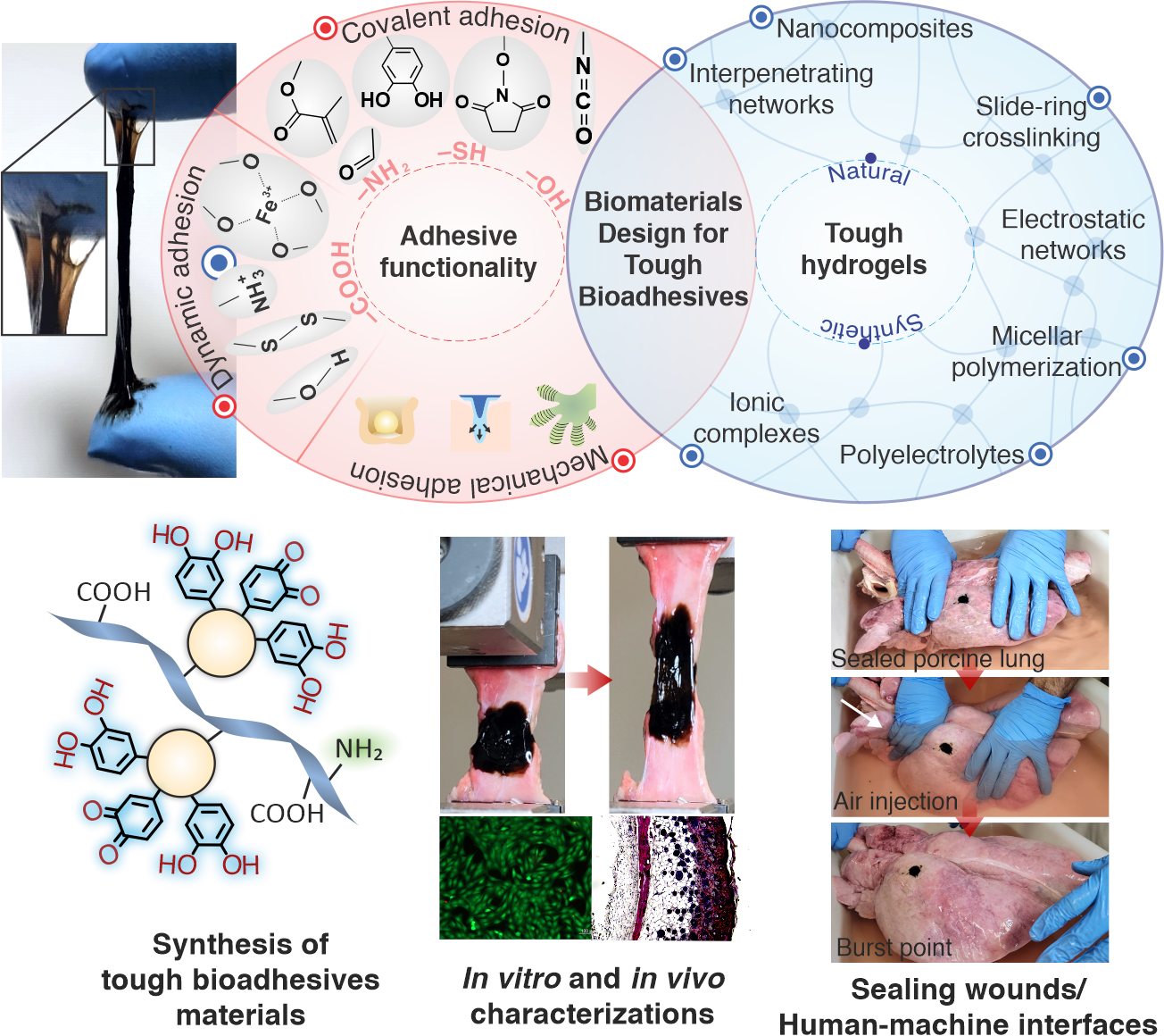 Our work in mechanical biomaterials is centered on engineering next-generation materials that exhibit exceptional toughness and bioadhesive properties, specifically designed for minimally invasive applications. These materials are developed to mimic functionality of natural tissues, providing robust solutions that can be delivered through minimally invasive procedures.